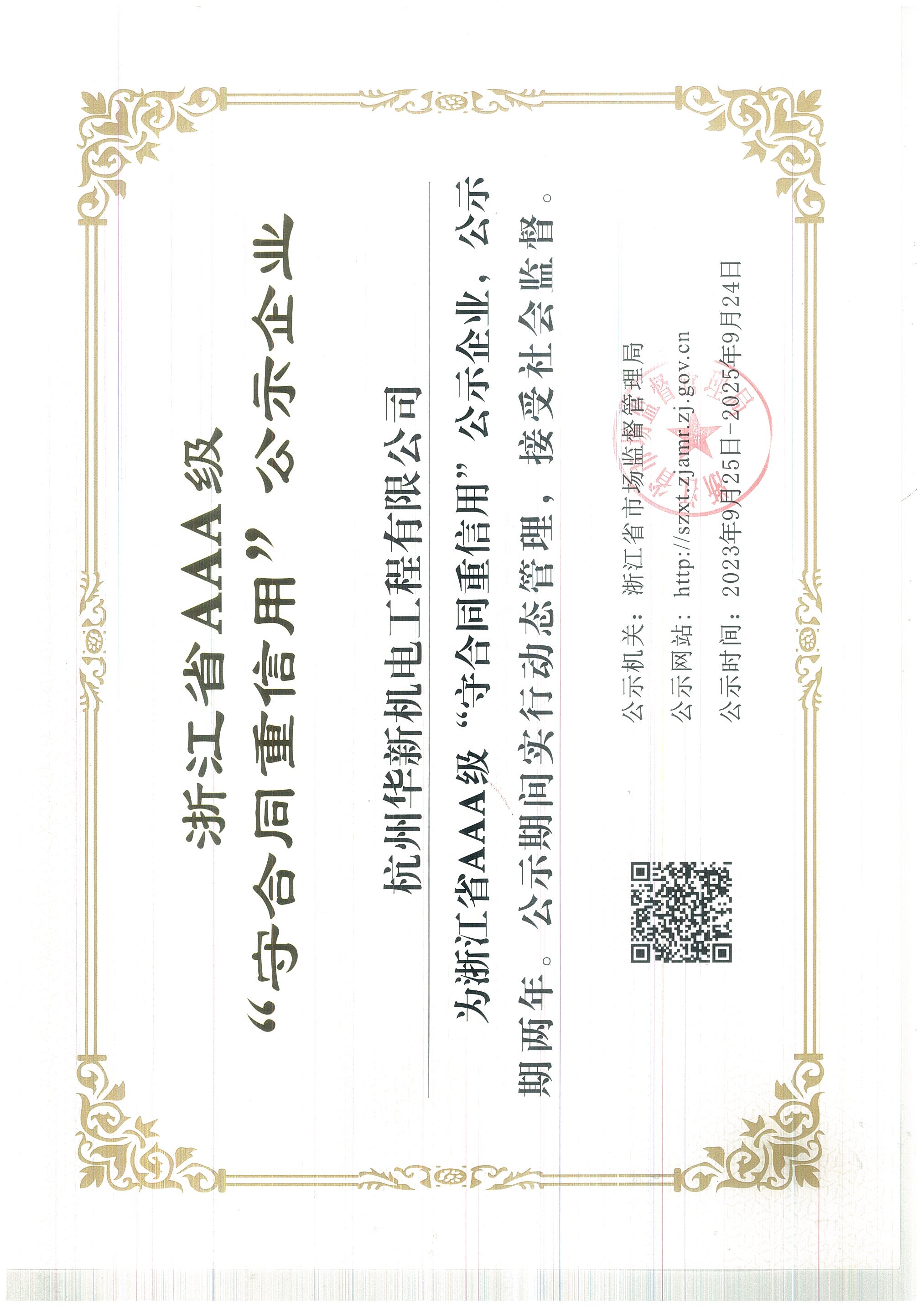 浙江省守合同重信用AAA級證書